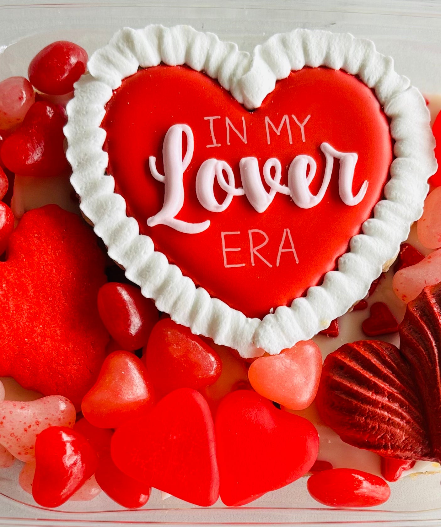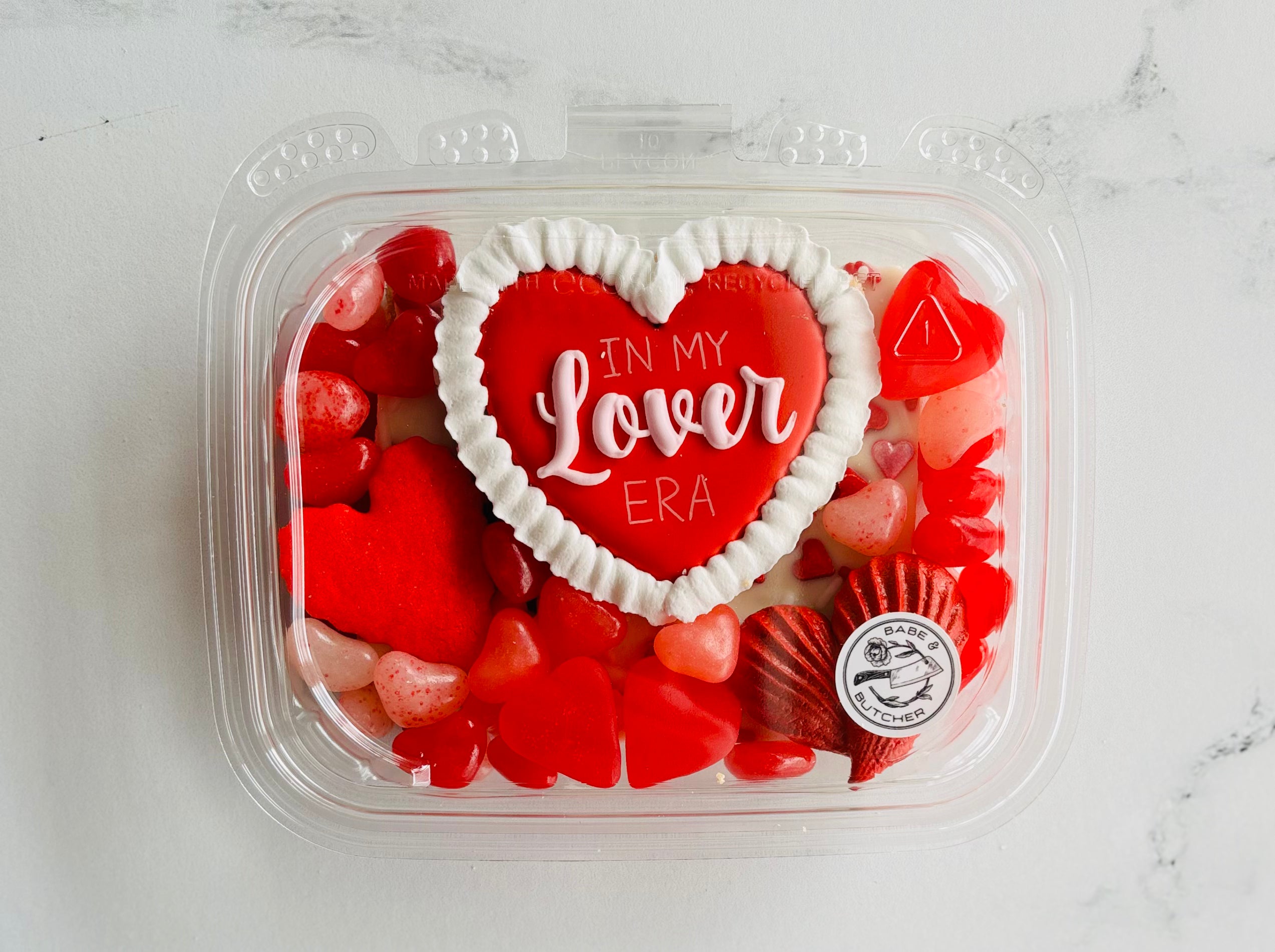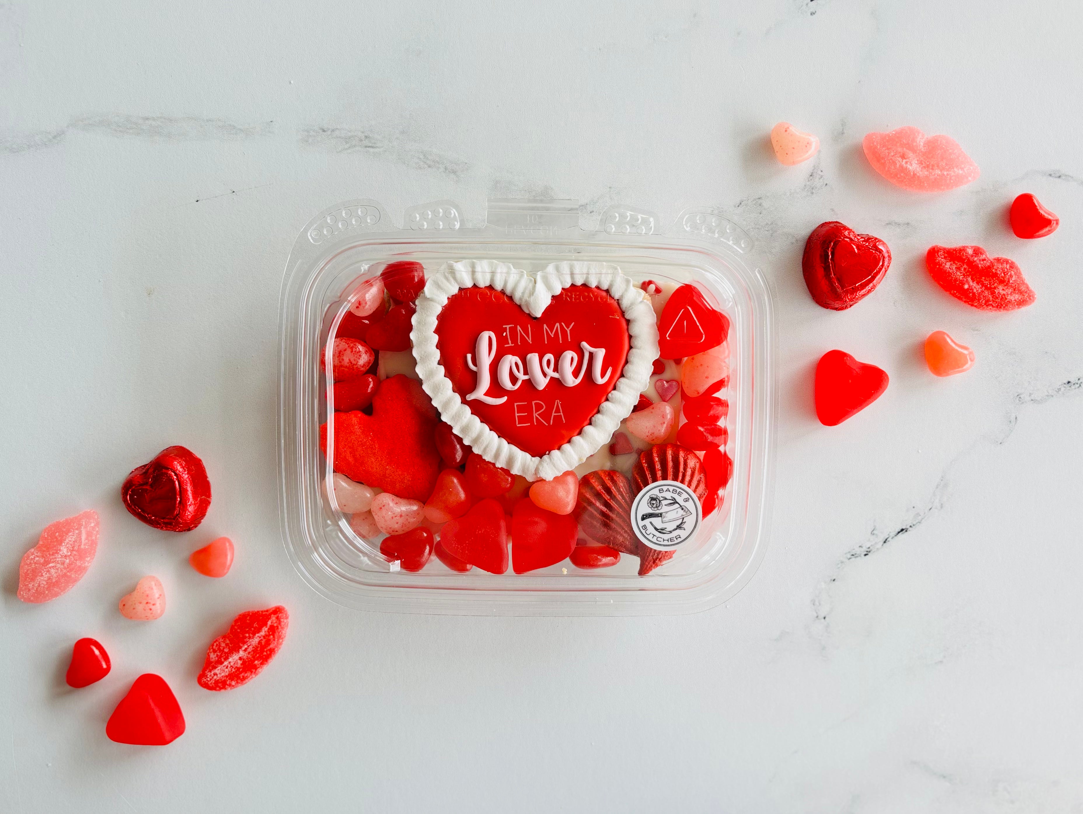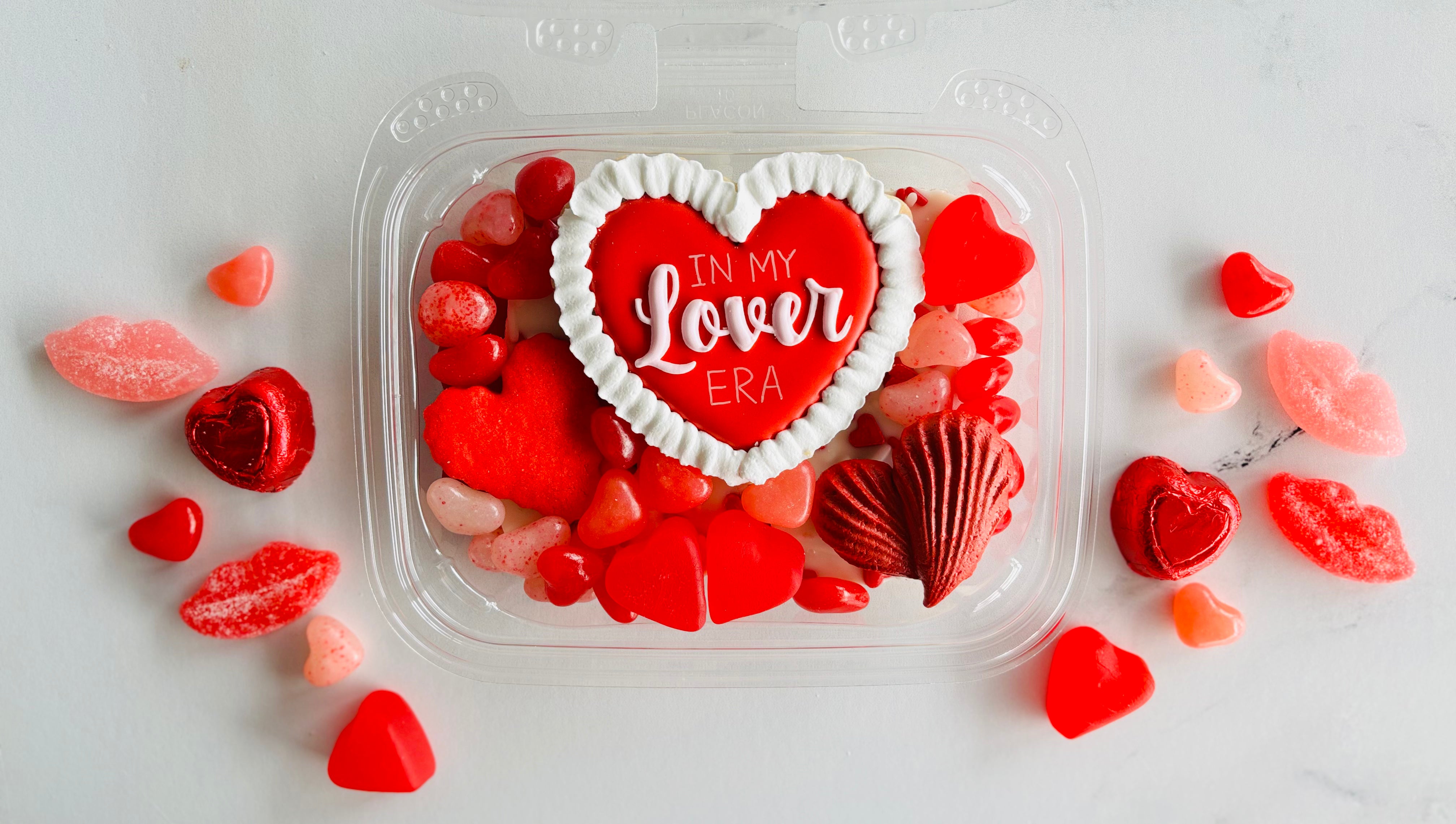 Available for pickup/delivery starting February 1st! We are in our Lover era. We collaborated with Sugar, Butter, Sass! on specialty cookies. This box includes a heart cookie from Sugar, Butter, Sass!, valentine chocolate "crack", a heart shaped sugar cookie, a heart meringue, and various Valentine's day candy. Candy may vary if we have an issue with the supply chain.