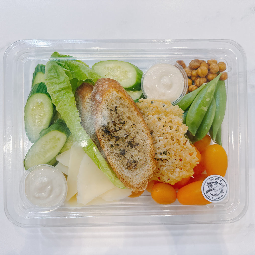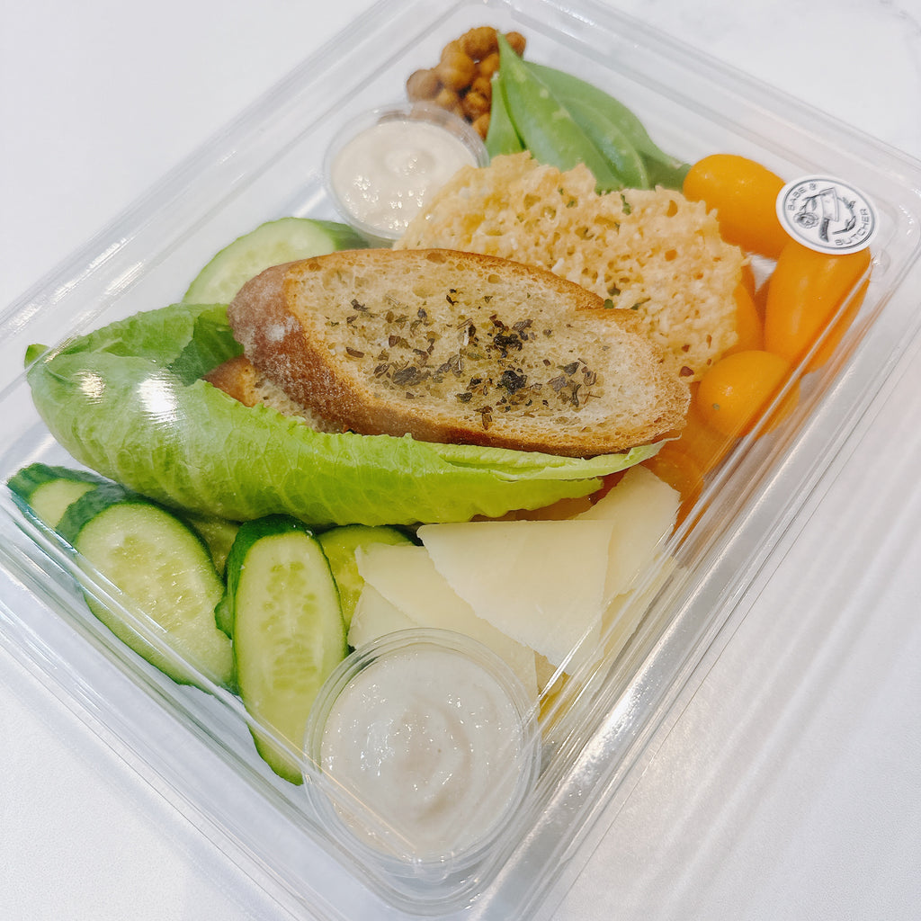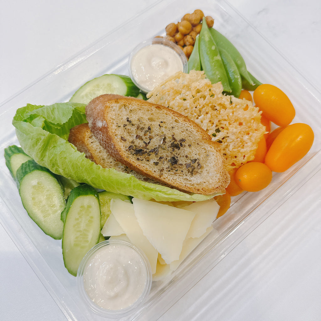 Caesar got a makeover. Enjoy romaine lettuce, homemade caesar dressing, parmesan crisps, crispy chick peas, "crouton" crostini, tomatoes, snap peas, cucumbers and shaved parmesan.