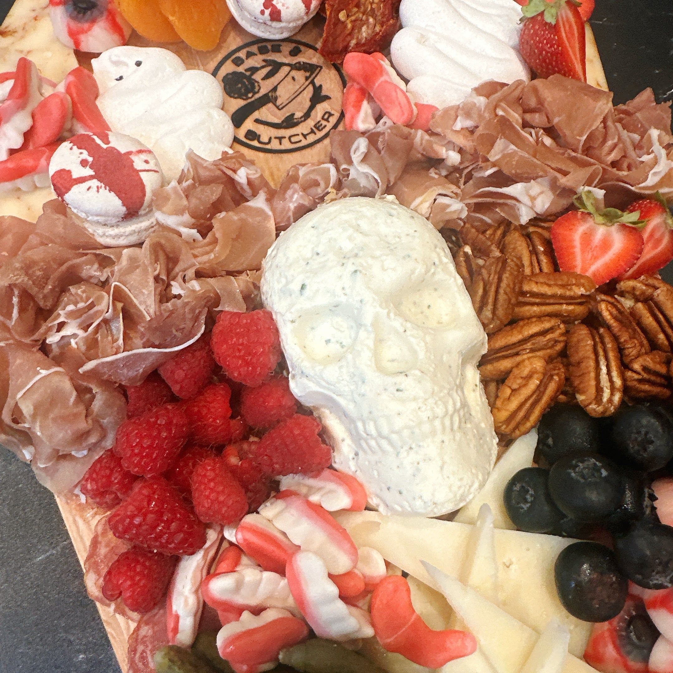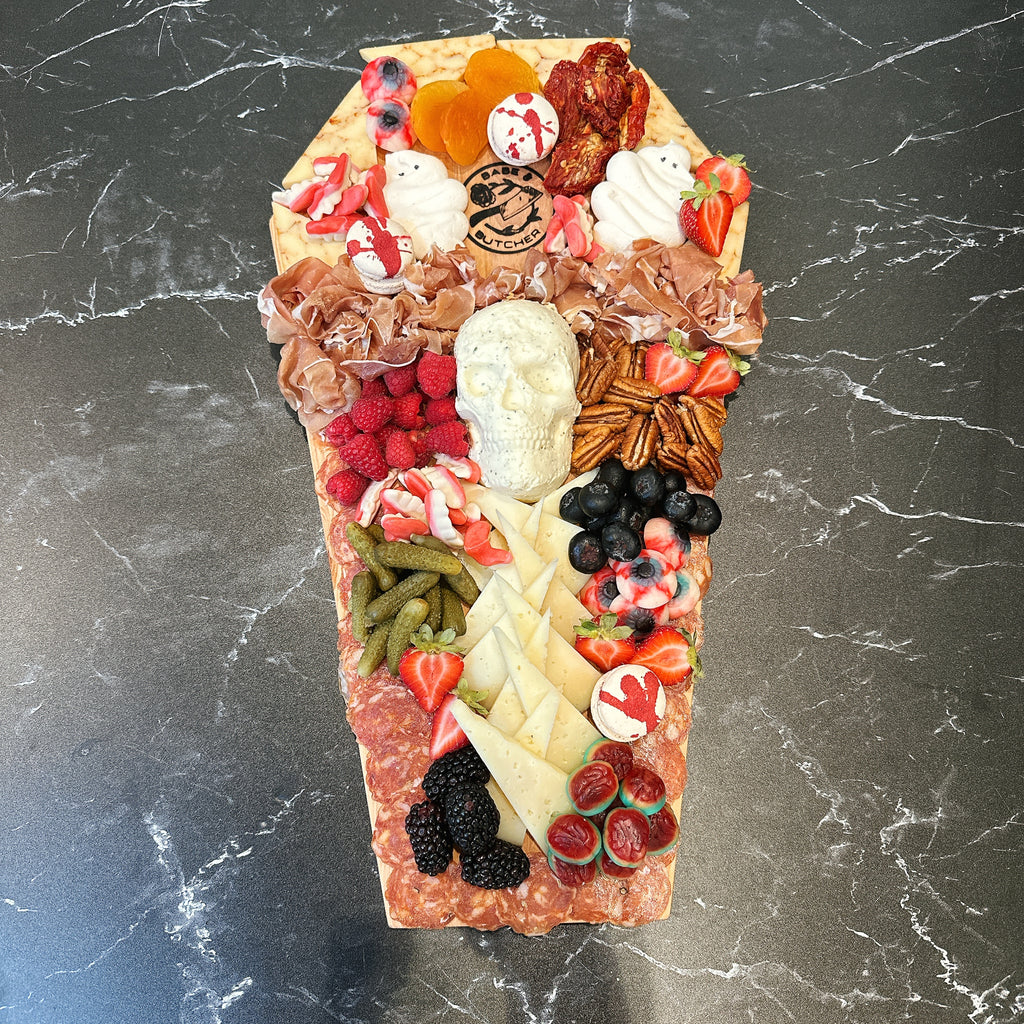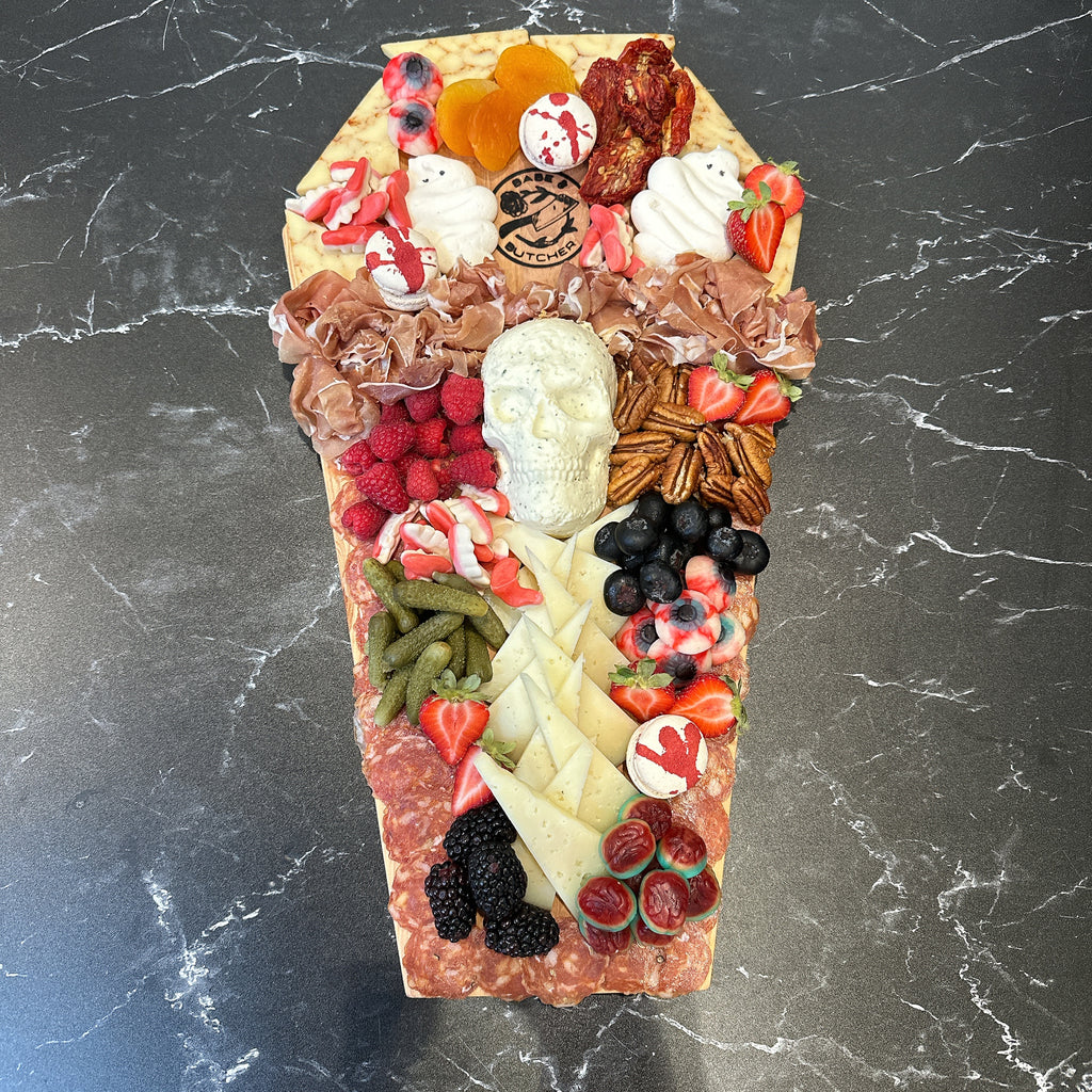 Coffin Board includes maple chili cheddar, 6 oz homemade Herb & Garlic SKULL, manchego cheese, prosciutto, hot sopressata, pickles, pecans, blackberries, blueberries, strawberries, dried fruit, blood spattered macarons, ghost meringues and Halloween candy all on a coffin shaped board. Serves 8-10+. Comes with sleeve of crackers.