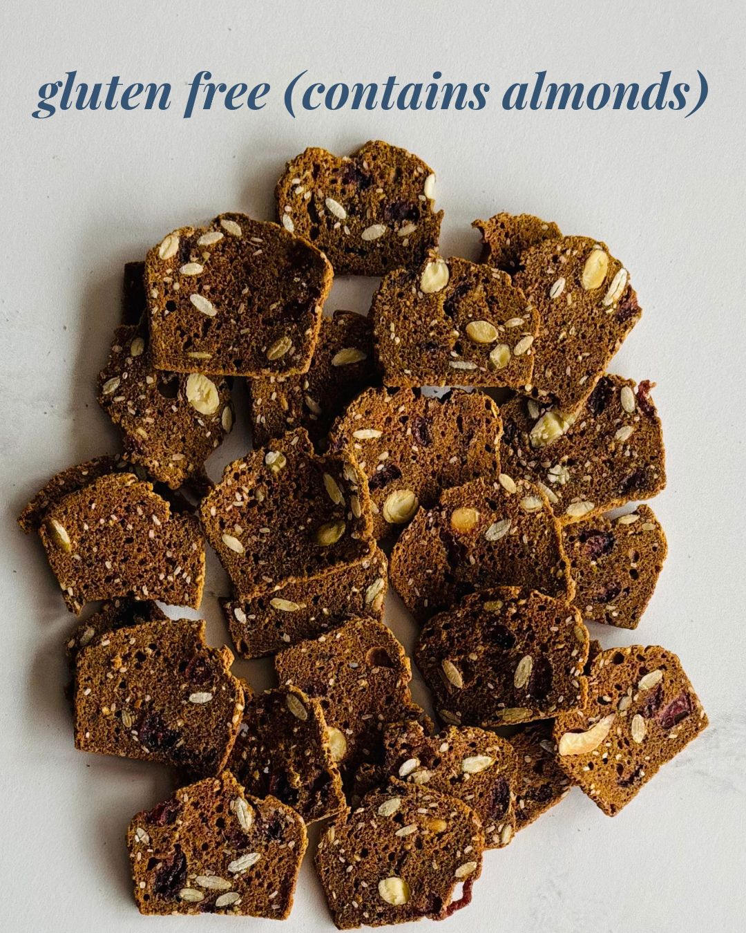 Our gluten free rosemary cranberry almond cracker is an earthy delicious cracker. Contains: Milk, Almonds, Sesame
