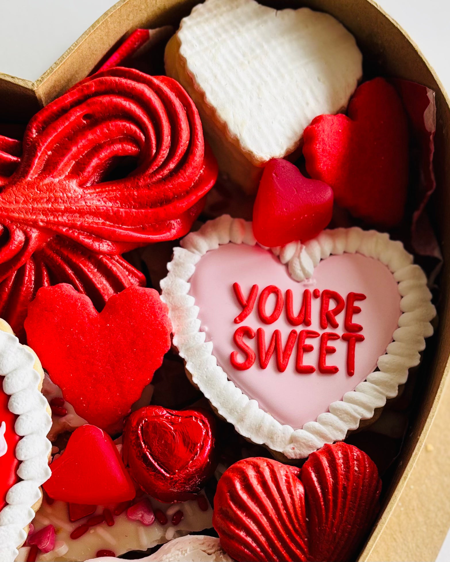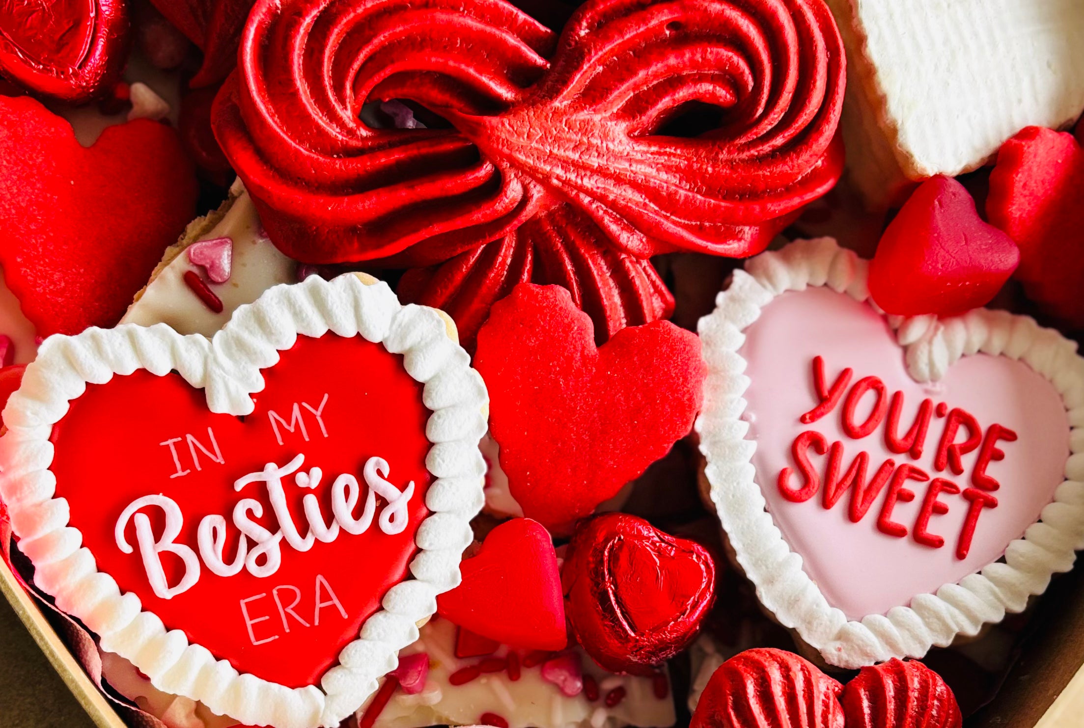 Available for pickup/delivery starting February 1st! We are BFFs with this heart shaped Galentine's box. We collaborated with Sugar, Butter, Sass! on specialty cookies. This box includes heart shaped brie, heart shaped homemade honey berry goat cheese, 3 specialty cookies from Sugar, Butter, Sass!, valentine chocolate "crack", a "bow" meringue, heart shaped sugar cookies, heart meringues, and various Valentine's day candy. The box is complete with ribbon and a bow to make it a beautiful and delicious gift. Candy may vary if we have an issue with the supply chain.