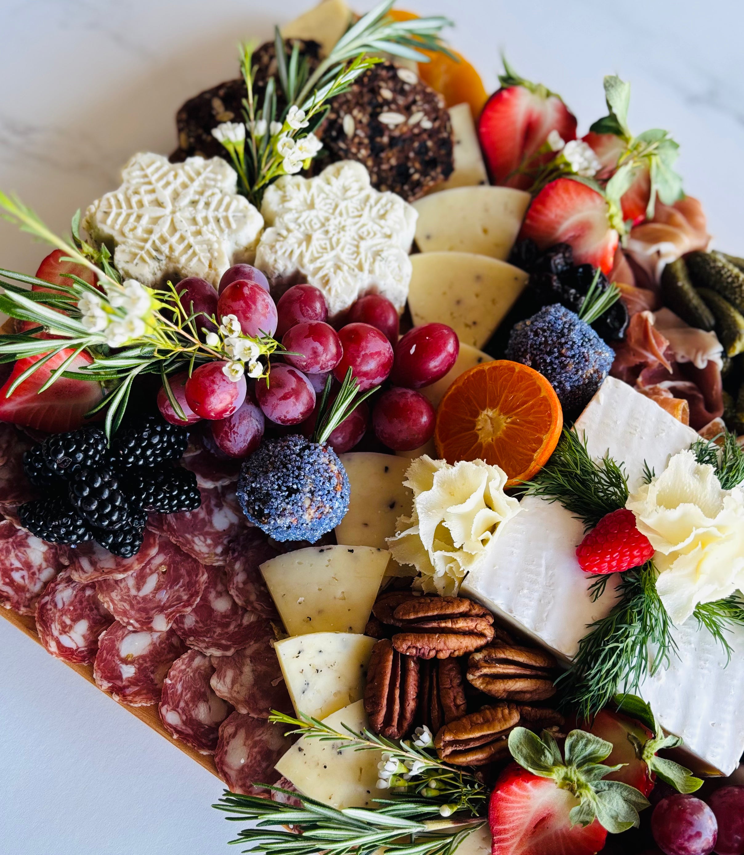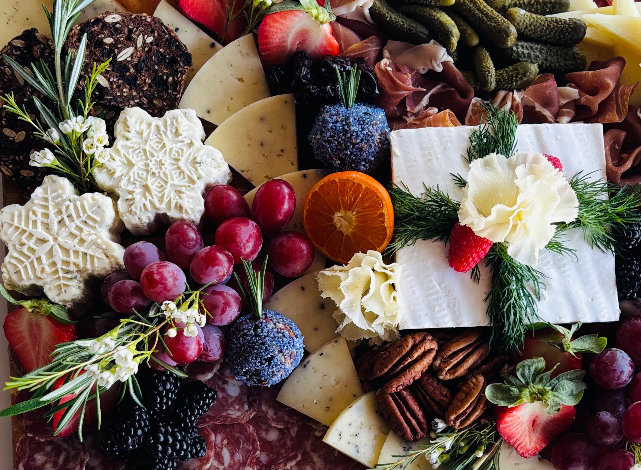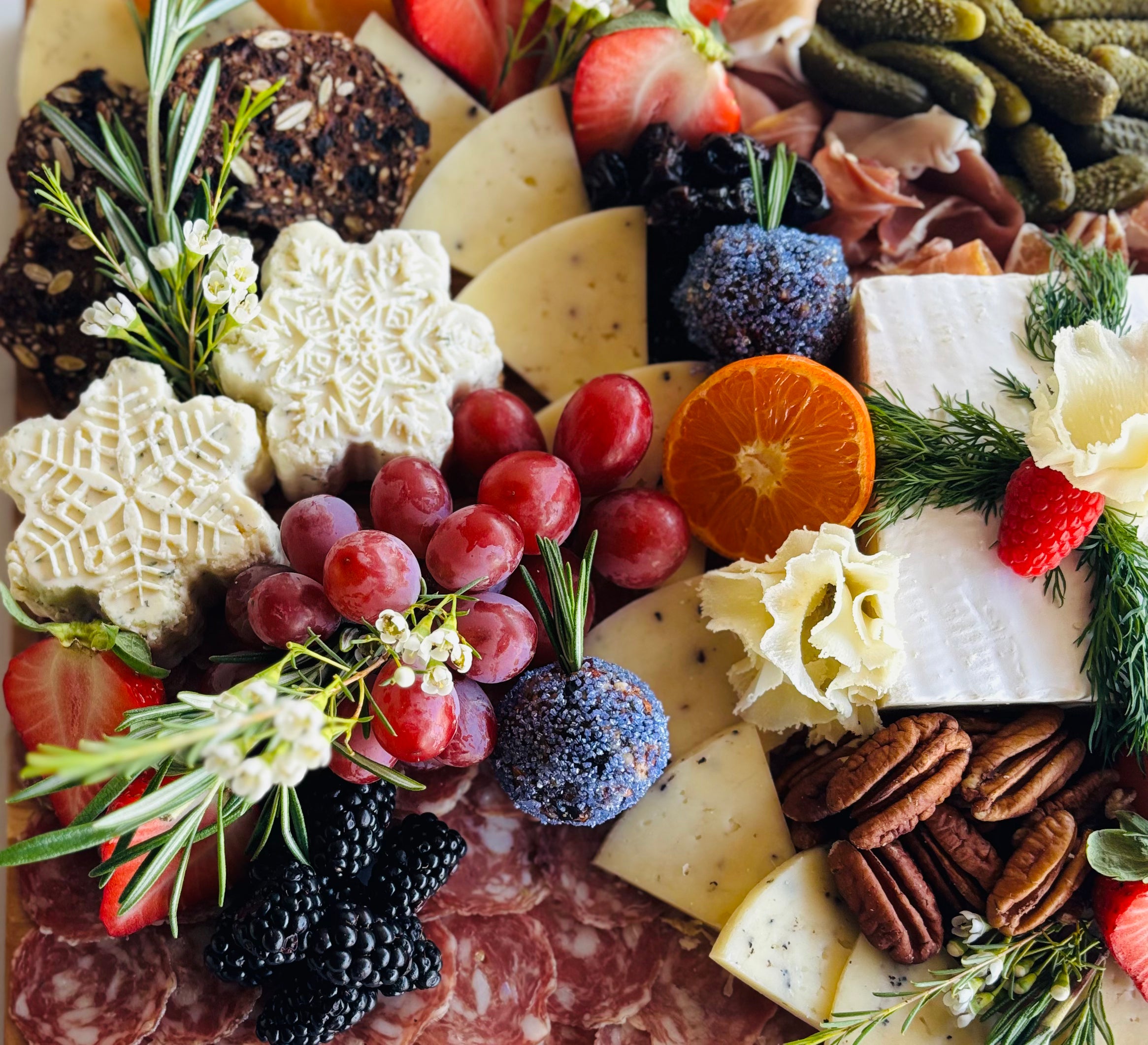 This is our special holiday charcuterie board with a present wrapped Brie, snowflake herb & garlic, manchego, tête de moine rosettes, truffle cheese, prosciutto, white wine fennel salami, hearty crackers, pecans and a new addition “sugar plum” balls made of nuts, dried fruit, holiday seasonings and dusted in sugar. Comes on a custom locally made wooden cutting board. Includes full sleeve of crackers.