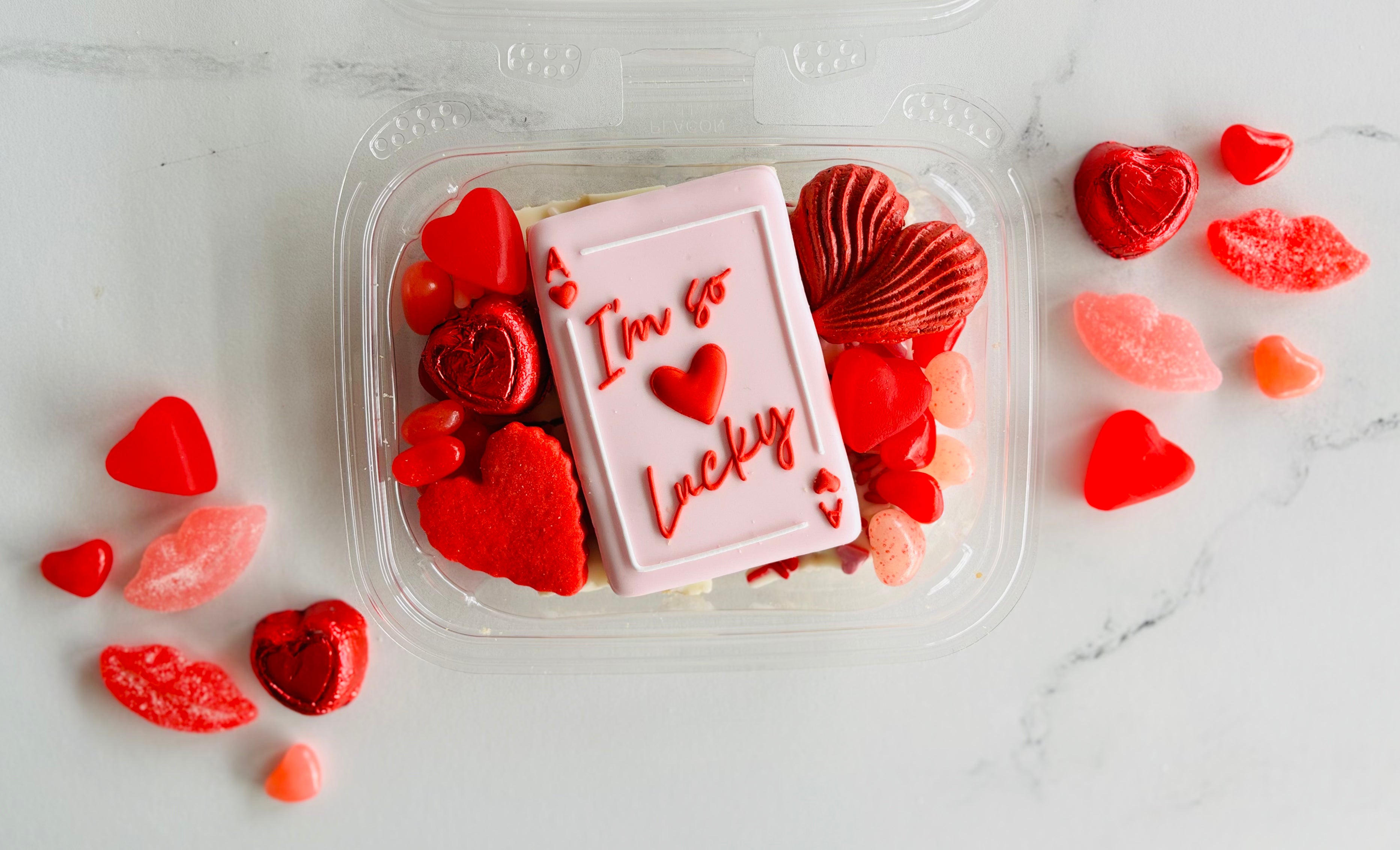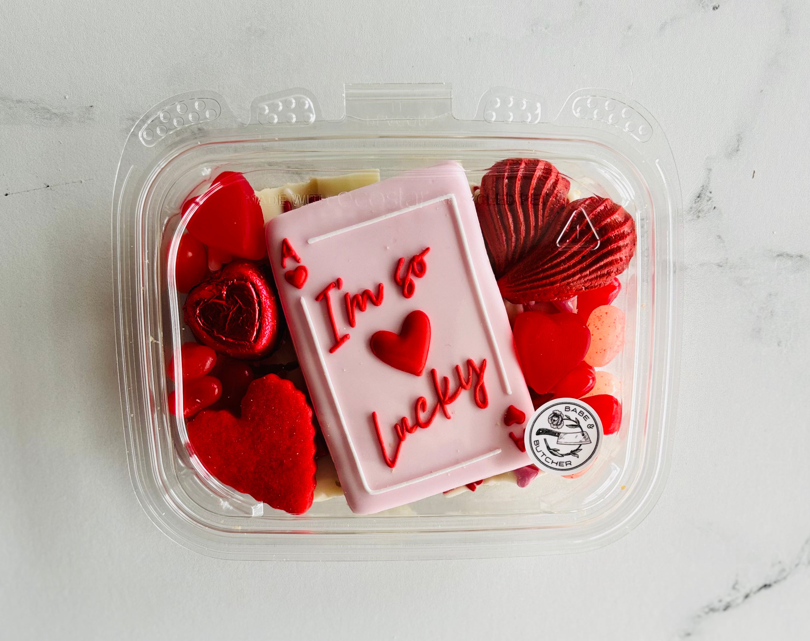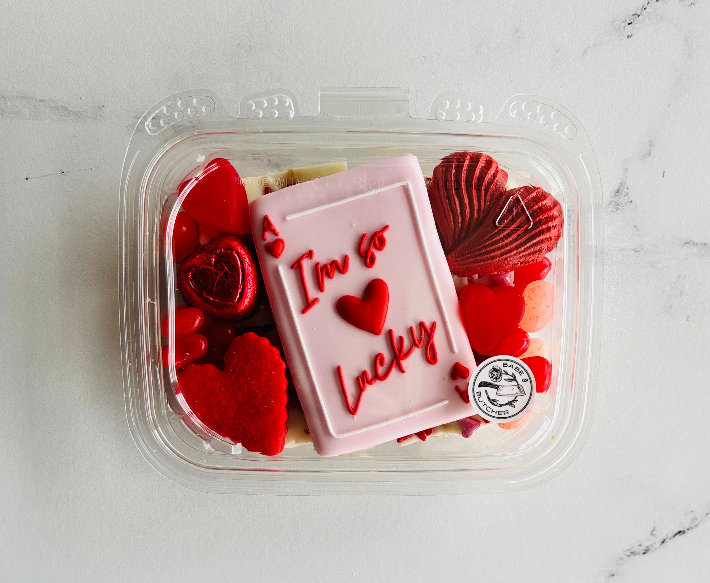 Available for pickup/delivery starting February 1st! We are so lucky to know you. We collaborated with Sugar, Butter, Sass! on specialty cookies. This box includes a heart cookie from Sugar, Butter, Sass!, valentine chocolate "crack", a heart shaped sugar cookie, a heart meringue, and various Valentine's day candy. Candy may vary if we have an issue with the supply chain.