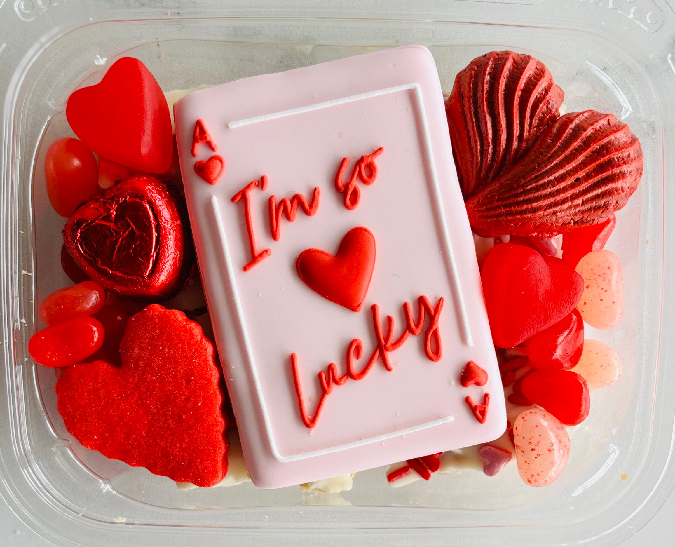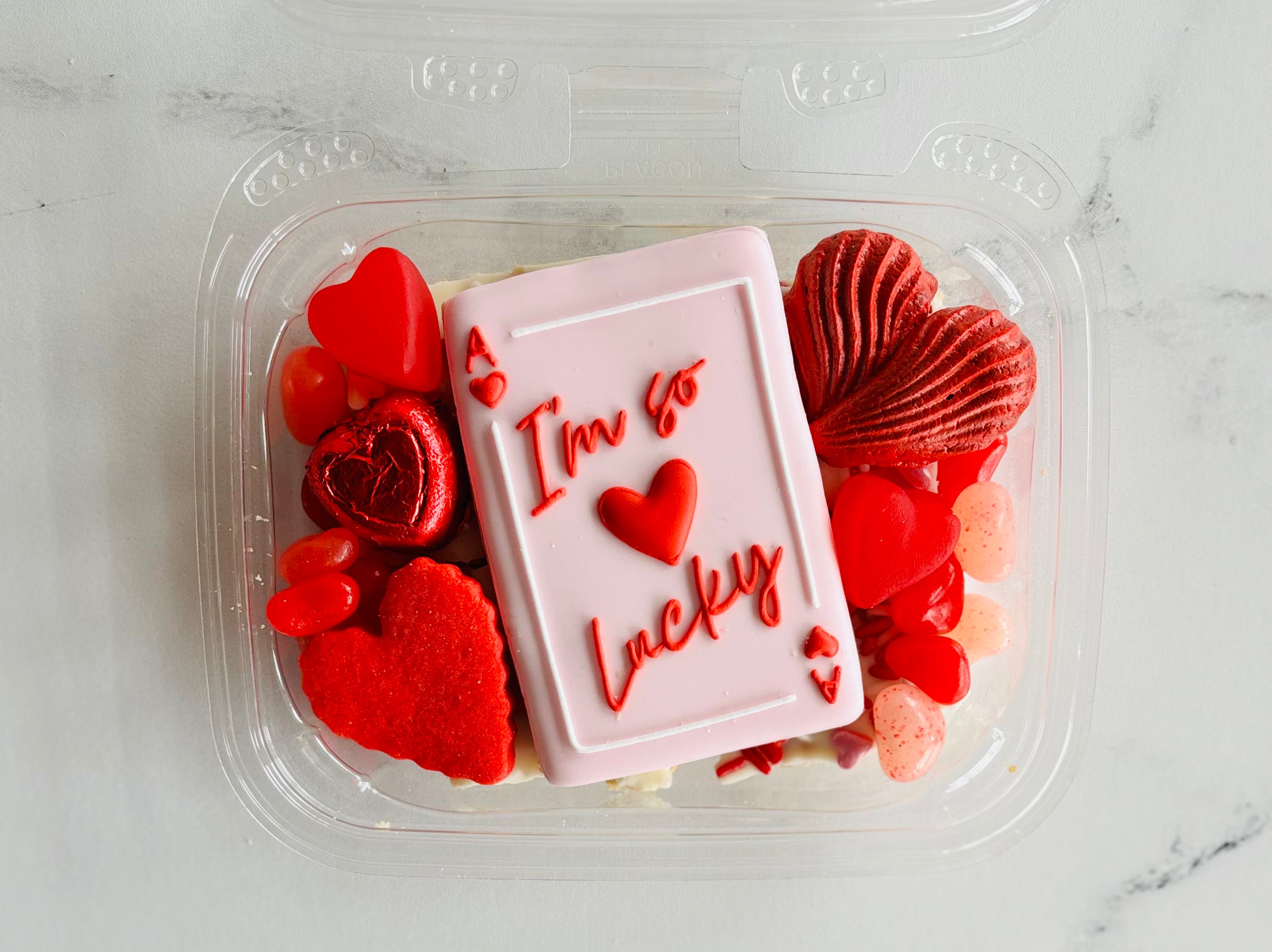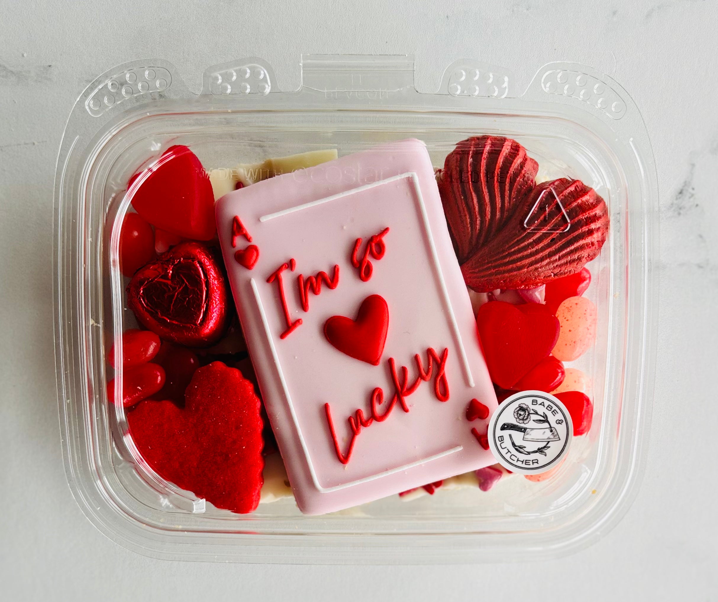Available for pickup/delivery starting February 1st! We are so lucky to know you. We collaborated with Sugar, Butter, Sass! on specialty cookies. This box includes a heart cookie from Sugar, Butter, Sass!, valentine chocolate "crack", a heart shaped sugar cookie, a heart meringue, and various Valentine's day candy. Candy may vary if we have an issue with the supply chain.